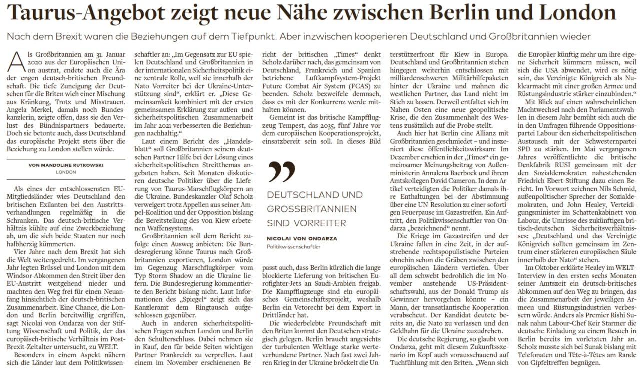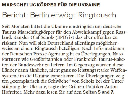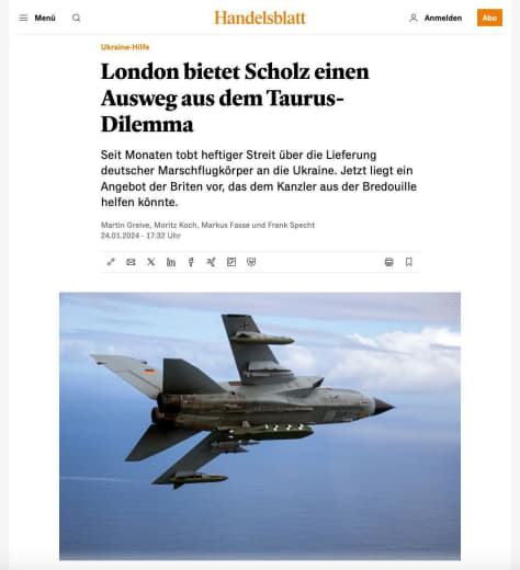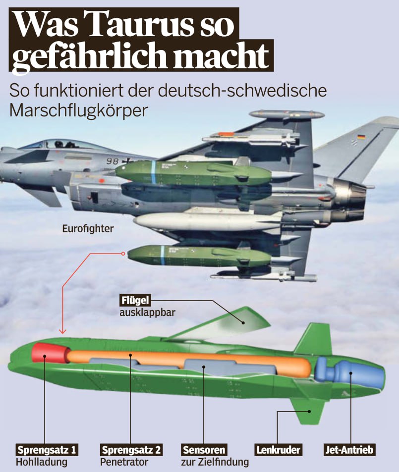 🇺🇦🇩🇪🇬🇧 Großbritannien wolle Taurus-Raketen von Deutschland kaufen, um weitere ähnliche Storm Shadow-Raketen an die Ukraine zu liefern, schreibt das Handelsblatt unter Berufung auf Quellen in Berlin