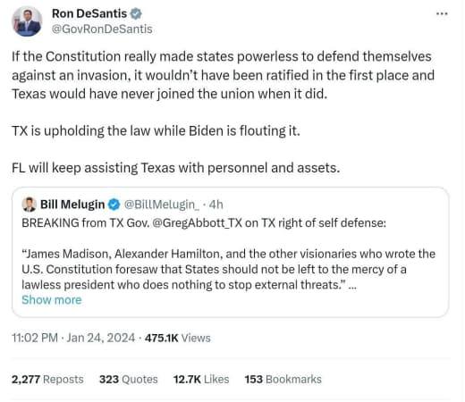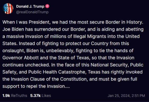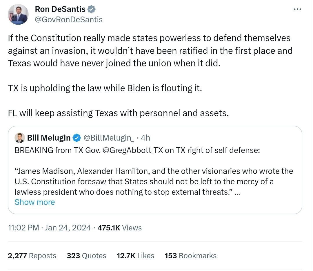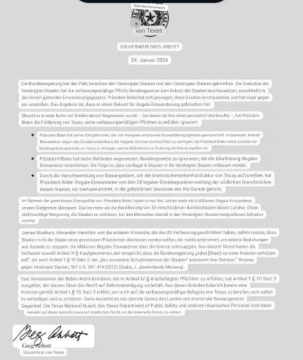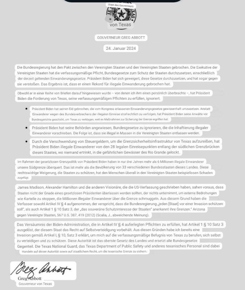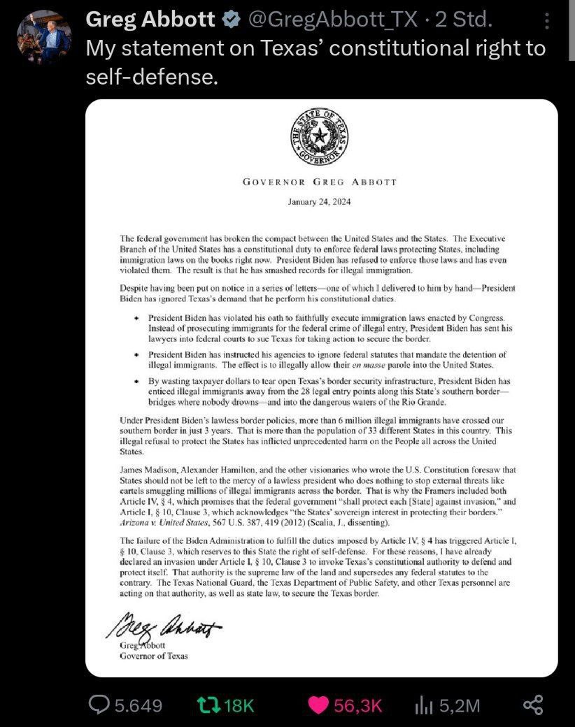 🇺🇸 Gouverneur von Texas, Greg Abbott, veröffentlicht eine Erklärung, in der er das Recht der Staaten auf verfassungsmäßige Selbstverteidigung im Umgang mit einem „gesetzlosen Präsidenten“ darlegt.