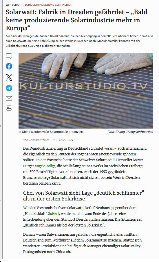 Die Deindustrialisierung in Deutschland schreitet voran – auch in Branchen, die eigentlich zu den Stützen der sogenannten Energiewende gehören sollten. In der Vorwoche hatte der Schweizer Solarmodul-Hersteller Meyer Burger angekündigt, die Schließung seines Werks im sächsischen Freiberg mit 500 Beschäftigten vorzubereiten. Auch der 1993 gegründete Branchenkollege Solarwatt ist sich nicht sicher, ob sein Werk in Dresden bestehen bleiben kann.